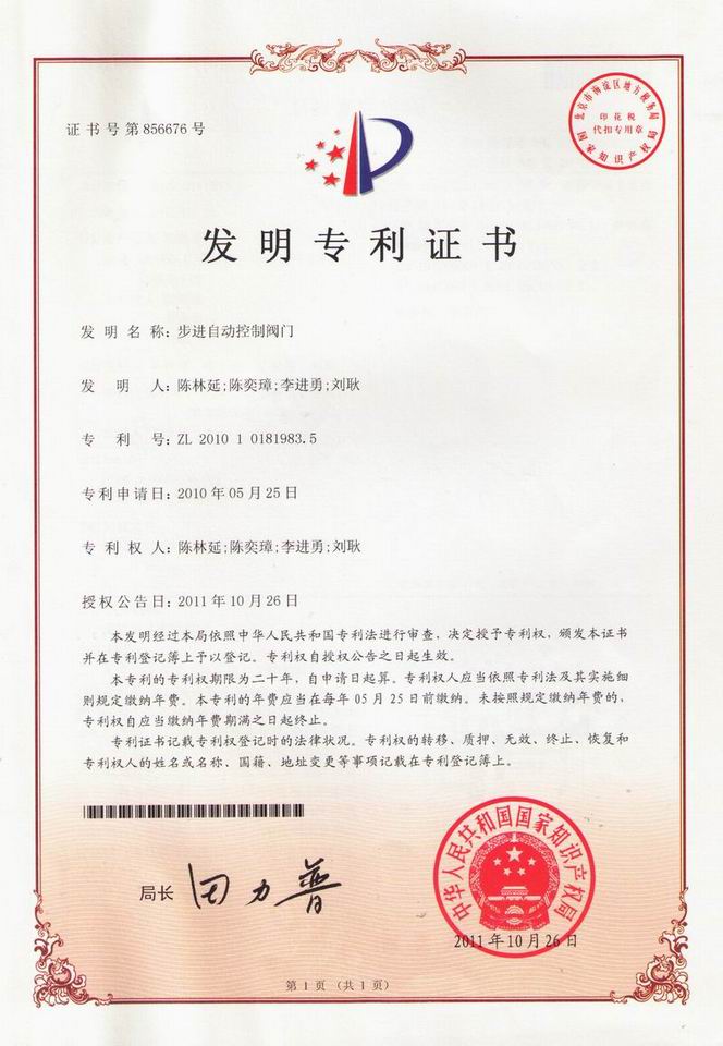 經(jīng)過公司研究人員兩年多的不懈努力,刻苦鉆研“步進自動控制閥門”研發(fā)成功,并于2010年5月25日向國家知識產(chǎn)權(quán)局申請專利保護。國家知識產(chǎn)權(quán)局經(jīng)過實質(zhì)性審查,于2011年10月26日授予專利權(quán)并頒發(fā)發(fā)明專利證書。